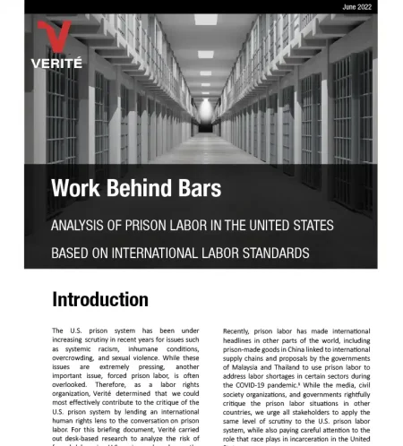 This briefing document analyzes U.S. prison labor through an international human rights framework. For this analysis, Verité carried out desk-based research analyzing prison labor conditions against International Labor Organization (ILO) standards, guidance, and forced labor indicators. The analysis identified a high risk of forced labor within the U.S. prison system when measured against ILO frameworks...